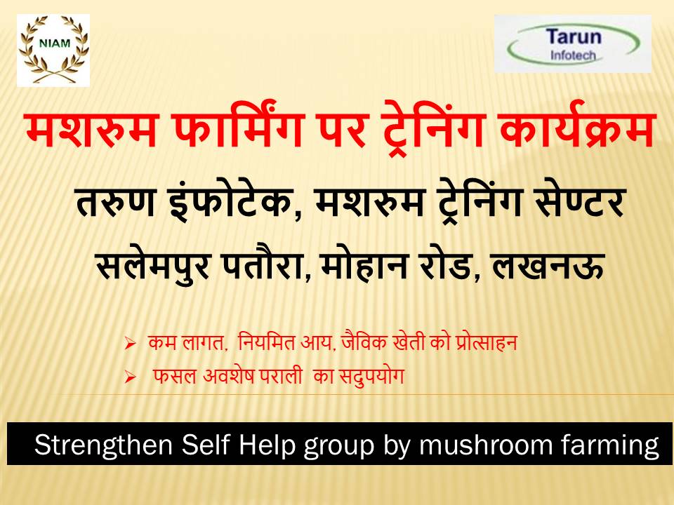 Tarun Infotech with help of NIAM provides free training to grow and sell mushroom. Farmers of Self Help Groups can awail this facility.